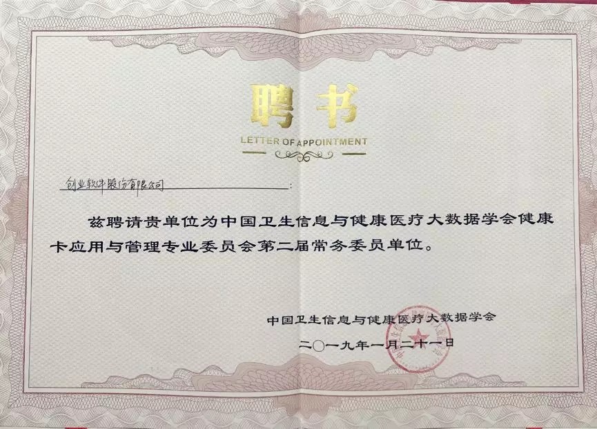 經(jīng)選舉產(chǎn)生新一屆專委會(huì)委員、常務(wù)委員、主任委員、副主任委員、秘書(shū)長(zhǎng),創(chuàng)業(yè)軟件受聘成為中國(guó)衛(wèi)生信息與健康醫(yī)療大數(shù)據(jù)學(xué)會(huì)健康卡應(yīng)用與管理專業(yè)委員會(huì)第二屆常務(wù)委員單位。